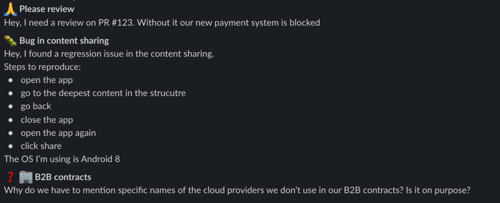 People come from various places, they have different experiences and they used to use tools in a different way. It’s ok to show how we use Slack in our company and what rules we follow. This ensures consistent communication, and reduces cognitive strain if we had to follow each conversation in a slightly different manner. It’s also ok to politely ask someone to follow the rules if they forget them, e.g. continue discussion in a channel instead in a thread.