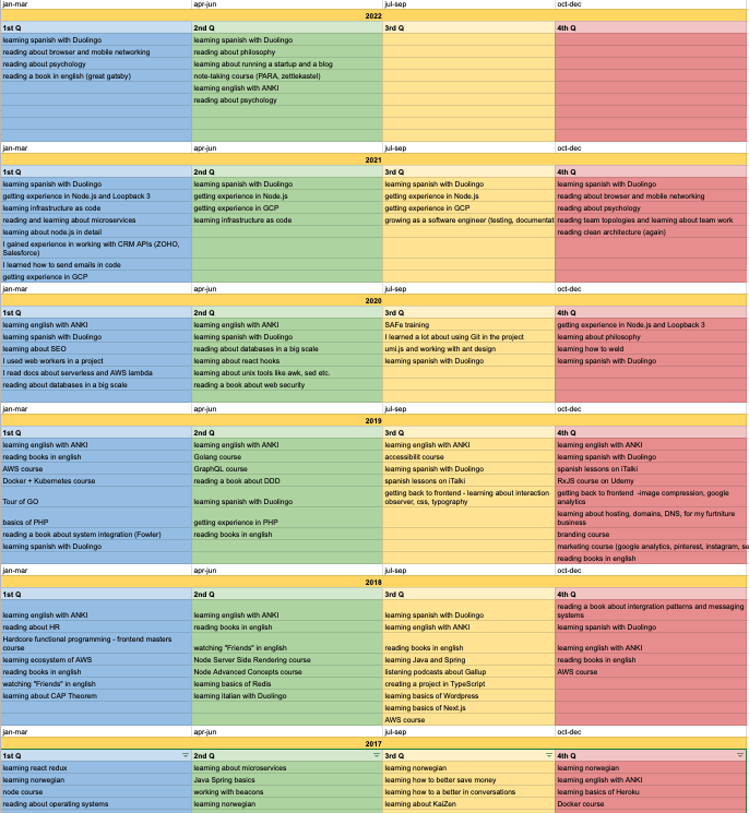I didn’t really pay too much attention to it but I had created a “learning tracking” sheet and it’s been my habit to fill it in for the last six years! When I looked at it I realized how much progress I had made. Of course there’s still so much to do, but it lets me feel good about myself, calm down a bit, and gain some motivation.