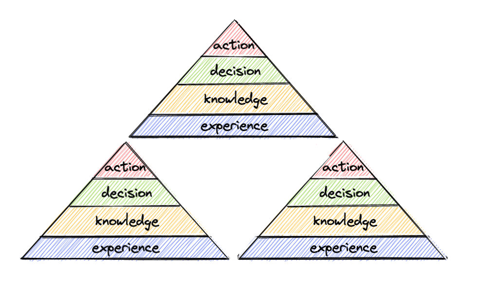 This is exactly what we do nowadays with our agile cycles. We create something, we gain experience and we take further actions to improve it. Nick Milton visualized it in the form of a pyramid fractal. We gain experience, convert it into knowledge, based on which we take decisions that lead to actions, which we can gain experience from.