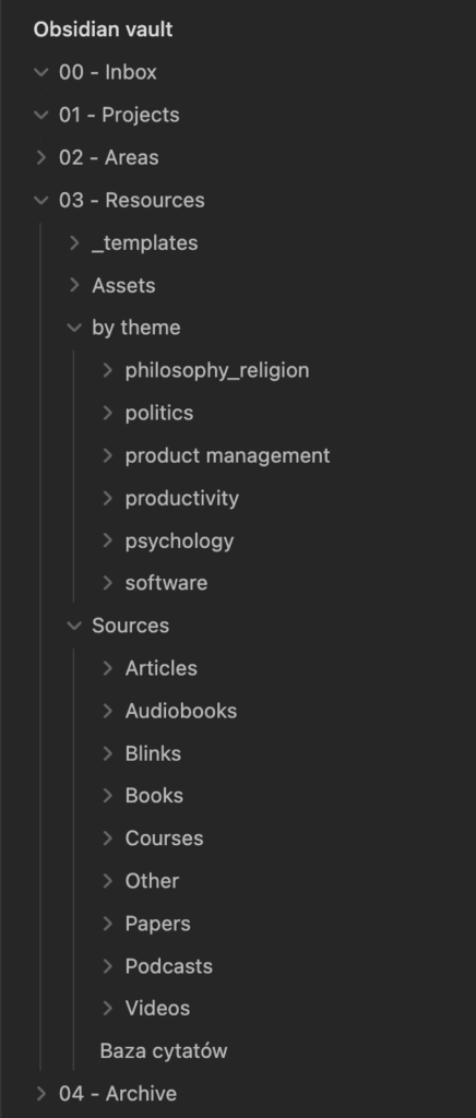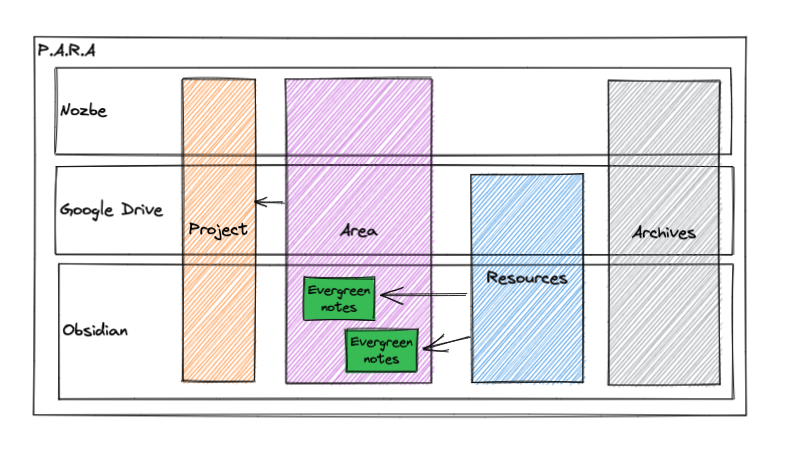 I let the PARA structure spread across both my private and work resources. They involve Google Drive, Nozbe, and Obsidian. E.g. I have 3 different google accounts: my personal one, the one from my software house, and the one from the software house’s end client. In each of them, I maintain the same structure therefore it is more straightforward for me how to navigate within them.